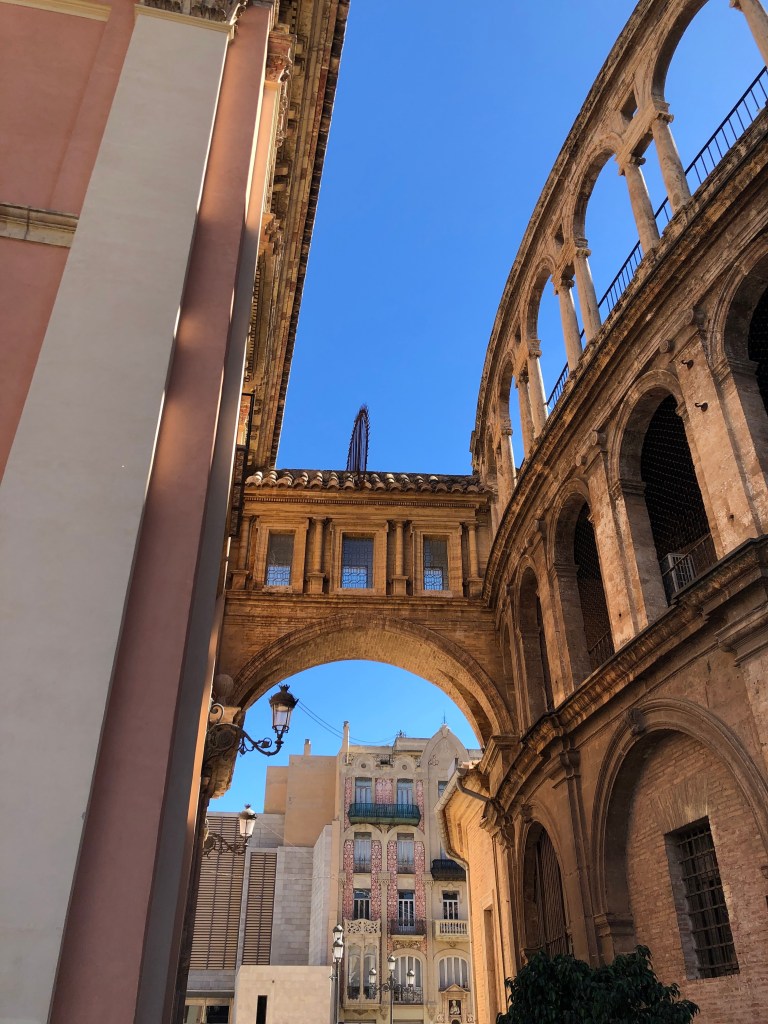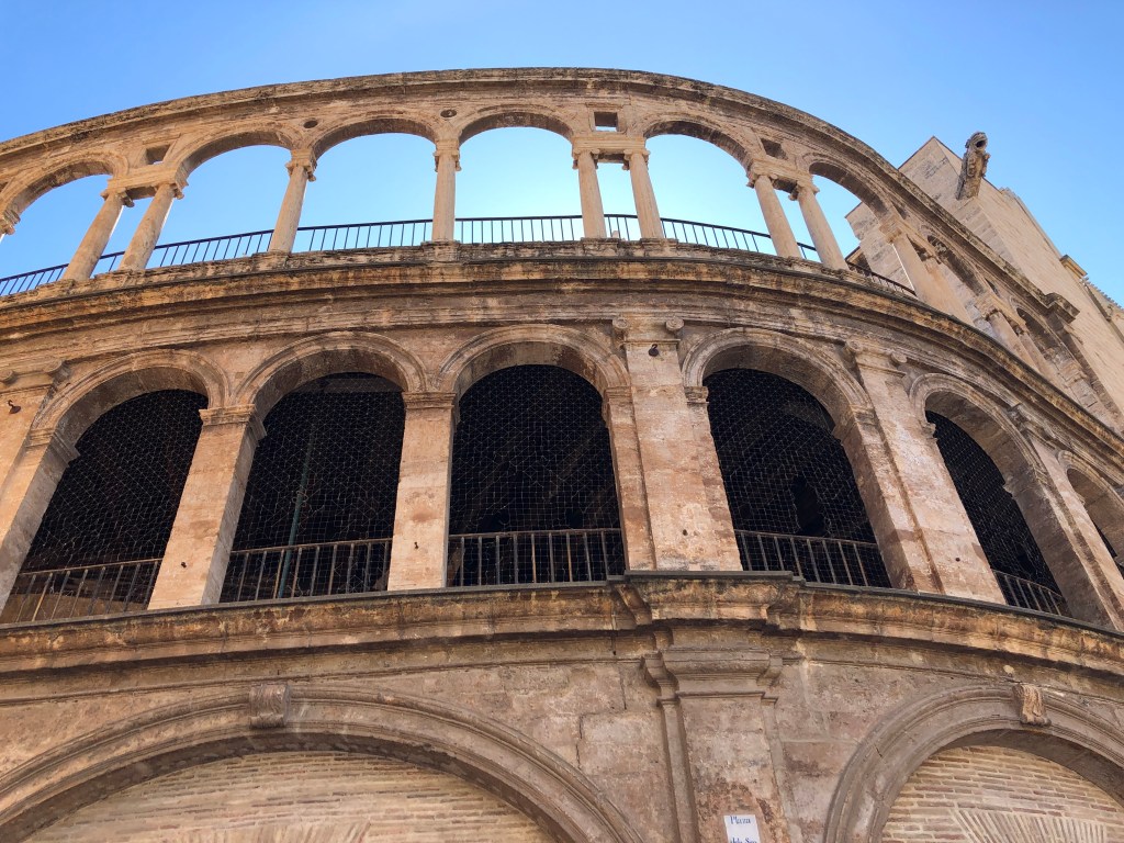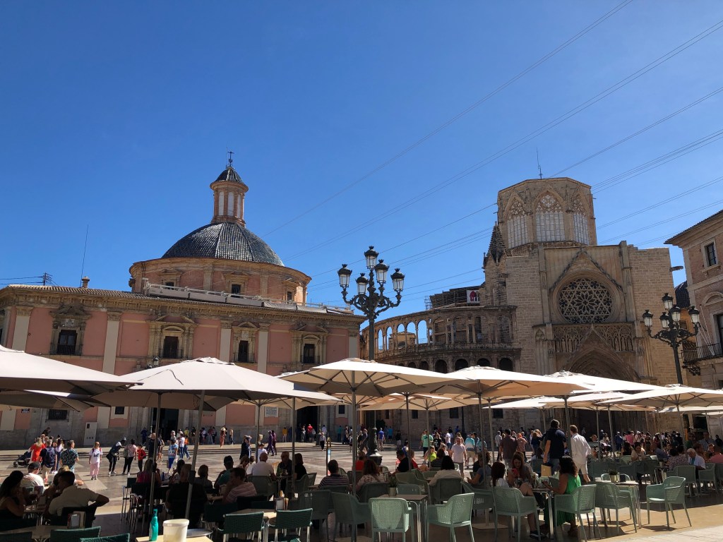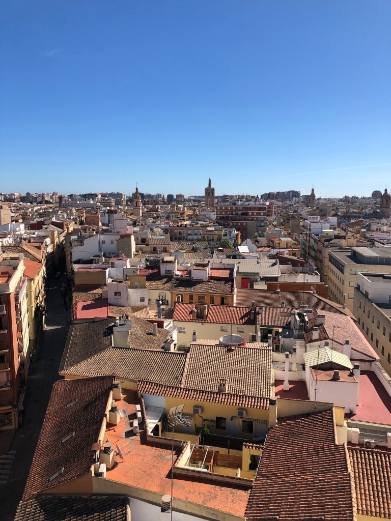 Walking around the old city is a true pleasure. It is always bustling with people whether it is tourists on bike or walking tours, locals doing their daily shopping or everyone just out for a walk and a bite to eat (any time is eating time). There are plazas after plazas each one with its own distinct character and all of them with at least one restaurant with tables outside. The architecture makes it just a feast for novice and professional photographers as well–medieval towers, beautiful gothic churches , charming store fronts and narrow winding pedestrian streets. It’s easy to get lost just looking up and taking photos if you aren’t careful! There is also almost also always something going on whether it is a festival or market and there is always some kind of music. During my meandering I ran into First Year students on a scavenger hunt for class, other students shopping in the Mercado Central, picked up some yummy (and free) Horchata with cake and witnessed a spontaneous dance party in the Plaza de la Reina. I ended up going back through the Plaza de Ayuntamiento down to Calle Colon, stopping for a healthy salad and some brief shopping in El Cortes Ingles to get some ingredients for my weekend baking project (more on that on a next post). All in all a great day out!