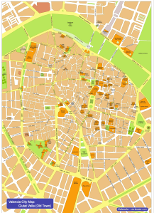 To me, Valencia is the perfect sized city–all the wonderful activities and services that big cities have but in a more consolidated and walkable layout. You can really get almost anywhere by biking or walking and if not, there is plenty of public transportation. It also reminds me a little bit of a mini Paris in the way that it is laid out–as it has a river (now a park) running through it and the neigboorhoods fan out like in a snail shape starting in the center. The center of the city is to the west of the riverbed and is what is called the “Cituat Vella”, Valencia for Old City. I live on the east side of the river and it takes about 20 mins for me to walk from my apartment to the Plaza del Ayuntamiento (town hall /government) which is considered the heart of the commercial city center.