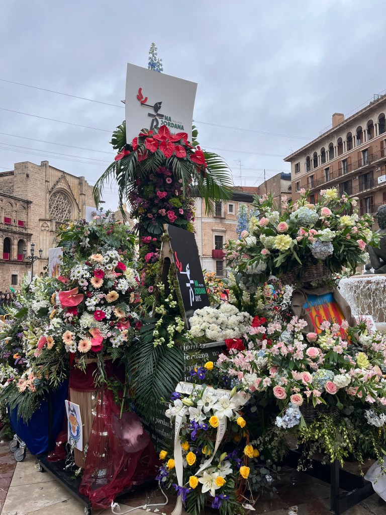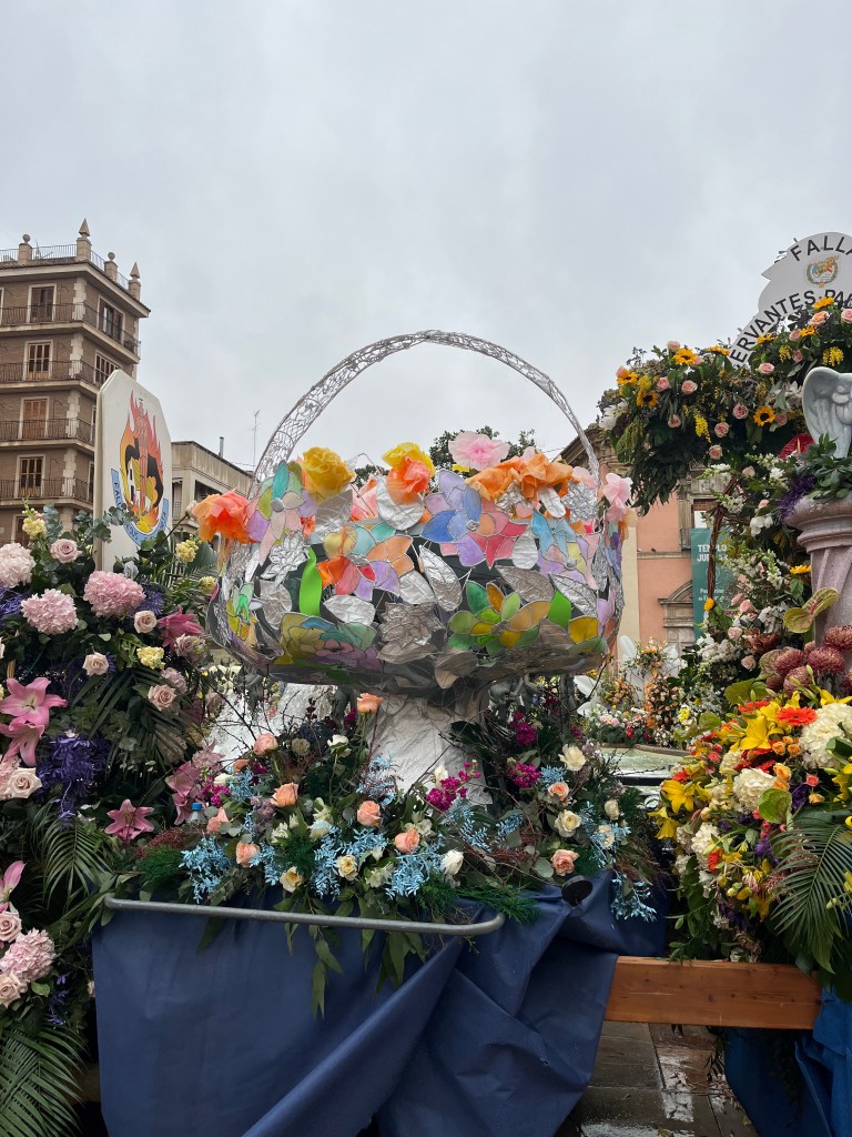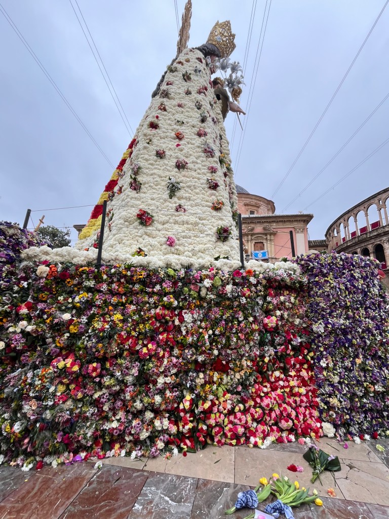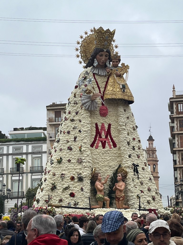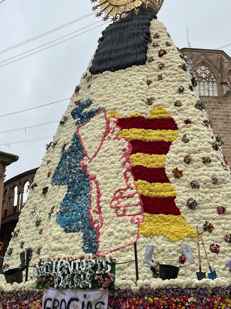 As you also know, this last year has been particularly difficult for Valencia with the floods (known as the Dana) in the last part of 2024. All of Fallas this year centred quite a bit on the Dana and the solidarity of the people coming together to help those in need. As you will see in an upcoming post, many of the Fallas had Ninots representing the Dana in some way. The Ofrenda of Virgin Mary was no different. You will see in the photos that the back of the Virgin Mary is decorated in the colours of Spain/Valencia and on the other, the Province of Valencia is represented in blue to mark the floods. In the middle, a hand of solidarity of the Spanish people coming together. Decorating around the bottom of the Virgin Mary are buckets, shovels and brooms covered in mud, with a sign that says ¨Voluntarios Dana, Gracias¨ representing and thanking the thousands of volunteers who came to help those impacted by the floods. Valencia will never forget.