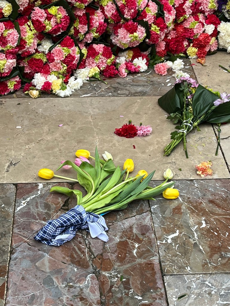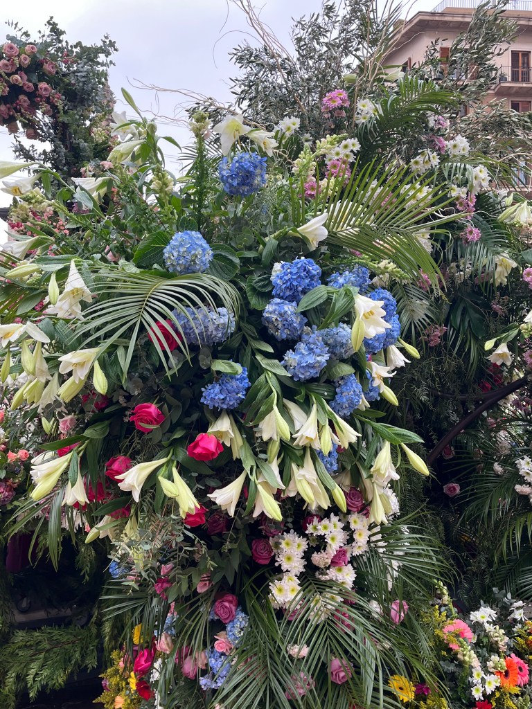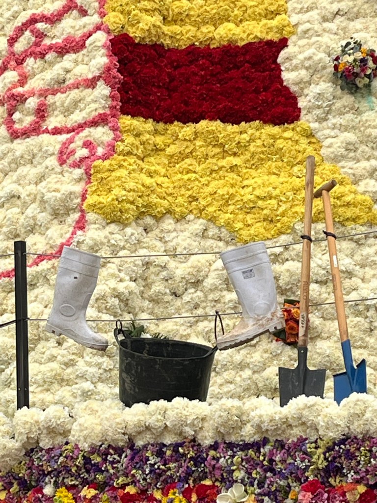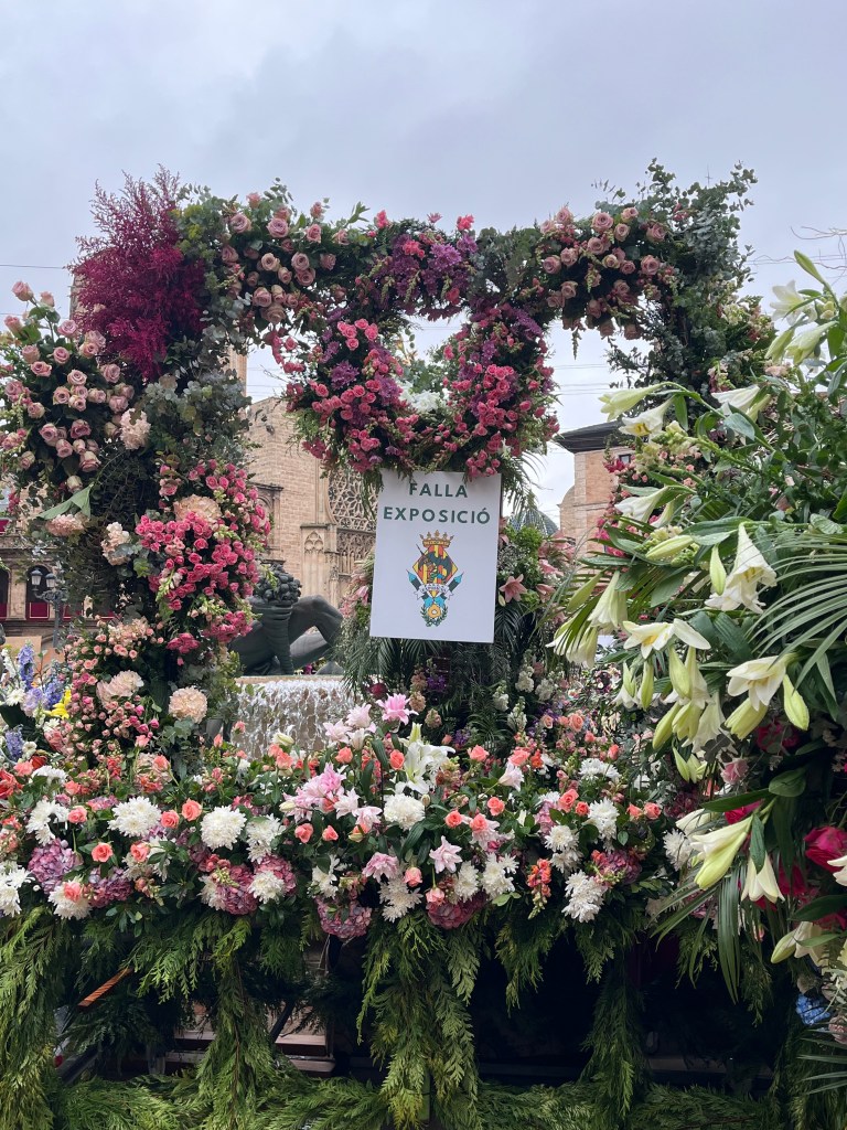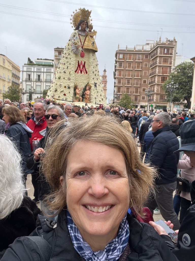 As you also know, this last year has been particularly difficult for Valencia with the floods (known as the Dana) in the last part of 2024. All of Fallas this year centred quite a bit on the Dana and the solidarity of the people coming together to help those in need. As you will see in an upcoming post, many of the Fallas had Ninots representing the Dana in some way. The Ofrenda of Virgin Mary was no different. You will see in the photos that the back of the Virgin Mary is decorated in the colours of Spain/Valencia and on the other, the Province of Valencia is represented in blue to mark the floods. In the middle, a hand of solidarity of the Spanish people coming together. Decorating around the bottom of the Virgin Mary are buckets, shovels and brooms covered in mud, with a sign that says ¨Voluntarios Dana, Gracias¨ representing and thanking the thousands of volunteers who came to help those impacted by the floods. Valencia will never forget.
